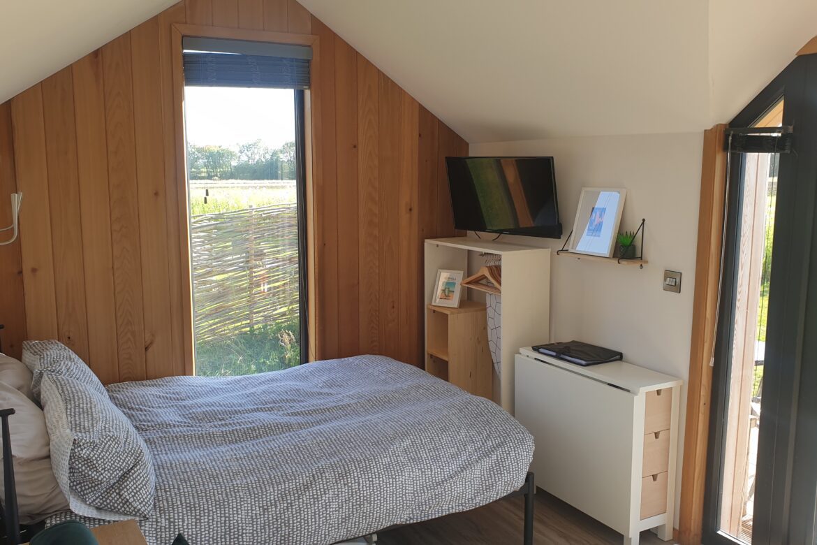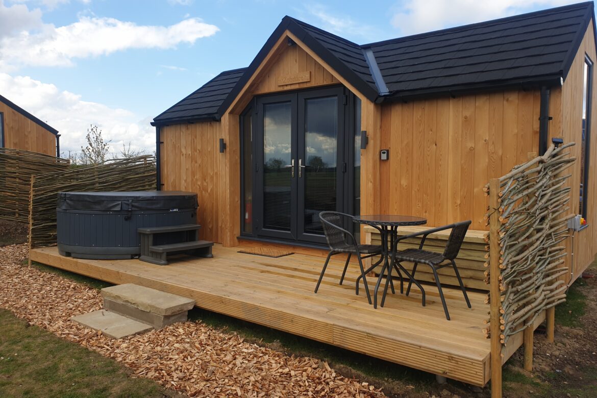 Zebedee cabin is located in the centre of the plot with open views of the surrounding farmland.